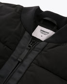 This regular fit bomber blouson jacket is made from 100% polyester, 88 G/SQM. It is water-repellent, has a TPU back coating, and is 5000mm waterproof. The lining is 100% recycled polyester, with faux down polyester padding for insulation. Features include polyfleece pocket bags, a branded YKK zip closure, large YKK zip pockets at the hips, and an inside zip pocket at the chest.