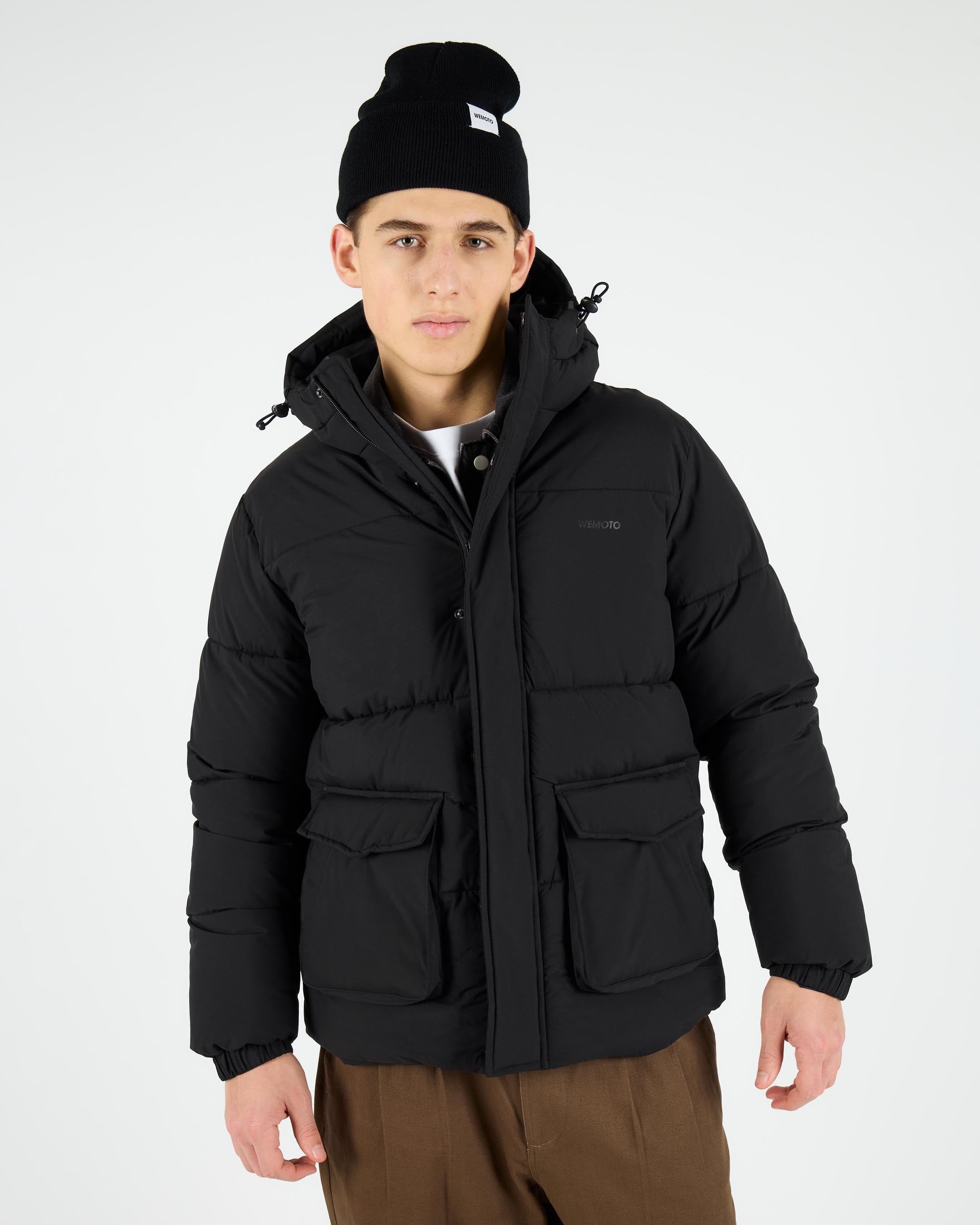 This regular fit hooded puffer jacket is crafted from 100% polyester, 88 G/SQM, with water-repellent finish, TPU back coating, and 5000mm waterproofing. The interior has recycled polyester lining and faux down polyester padding. Additional details include polyfleece pocket bags, snap buttons combined with a branded YKK zip closure, an inside chest zip pocket, and adjustable elasticated drawstrings at the hood and hem.