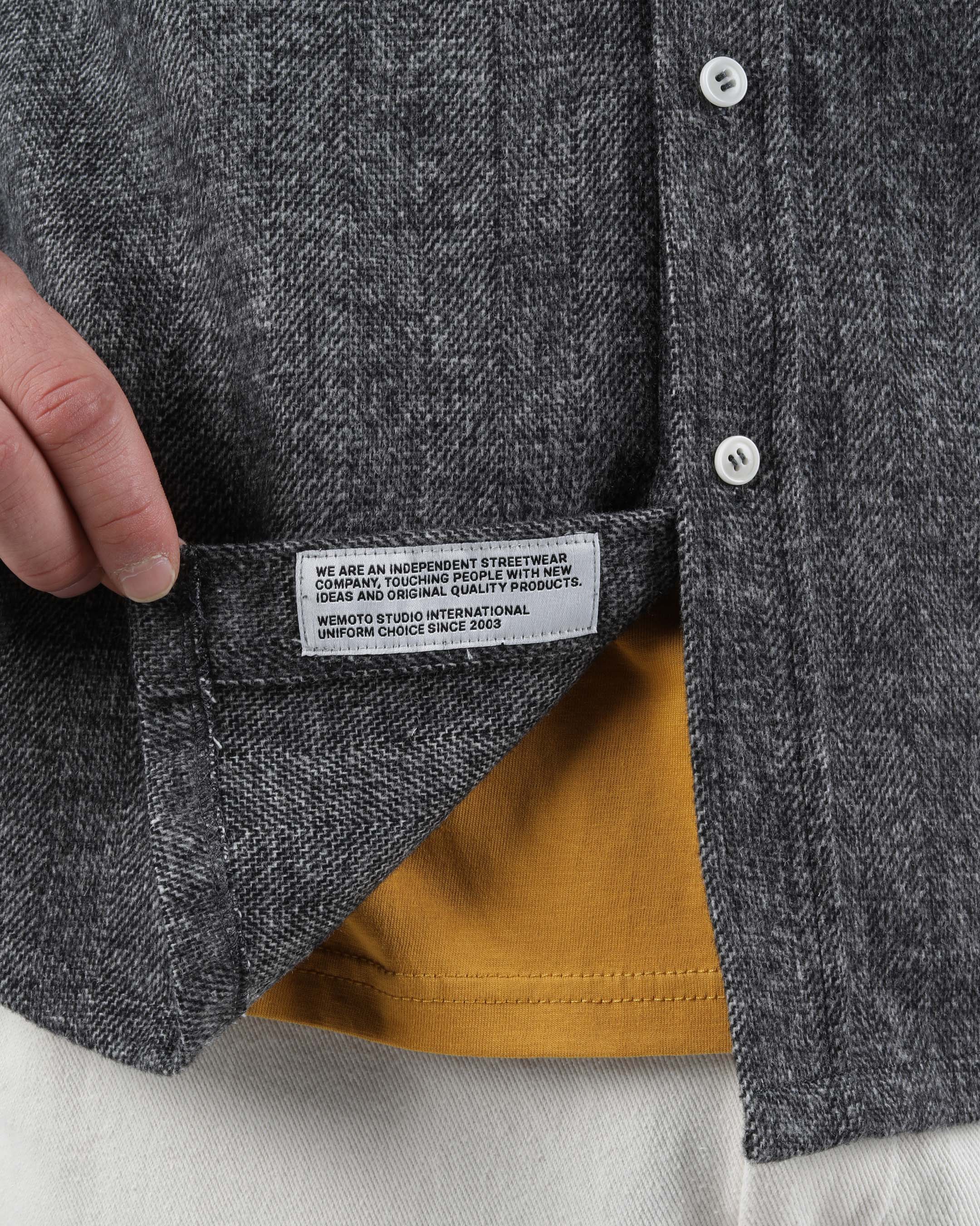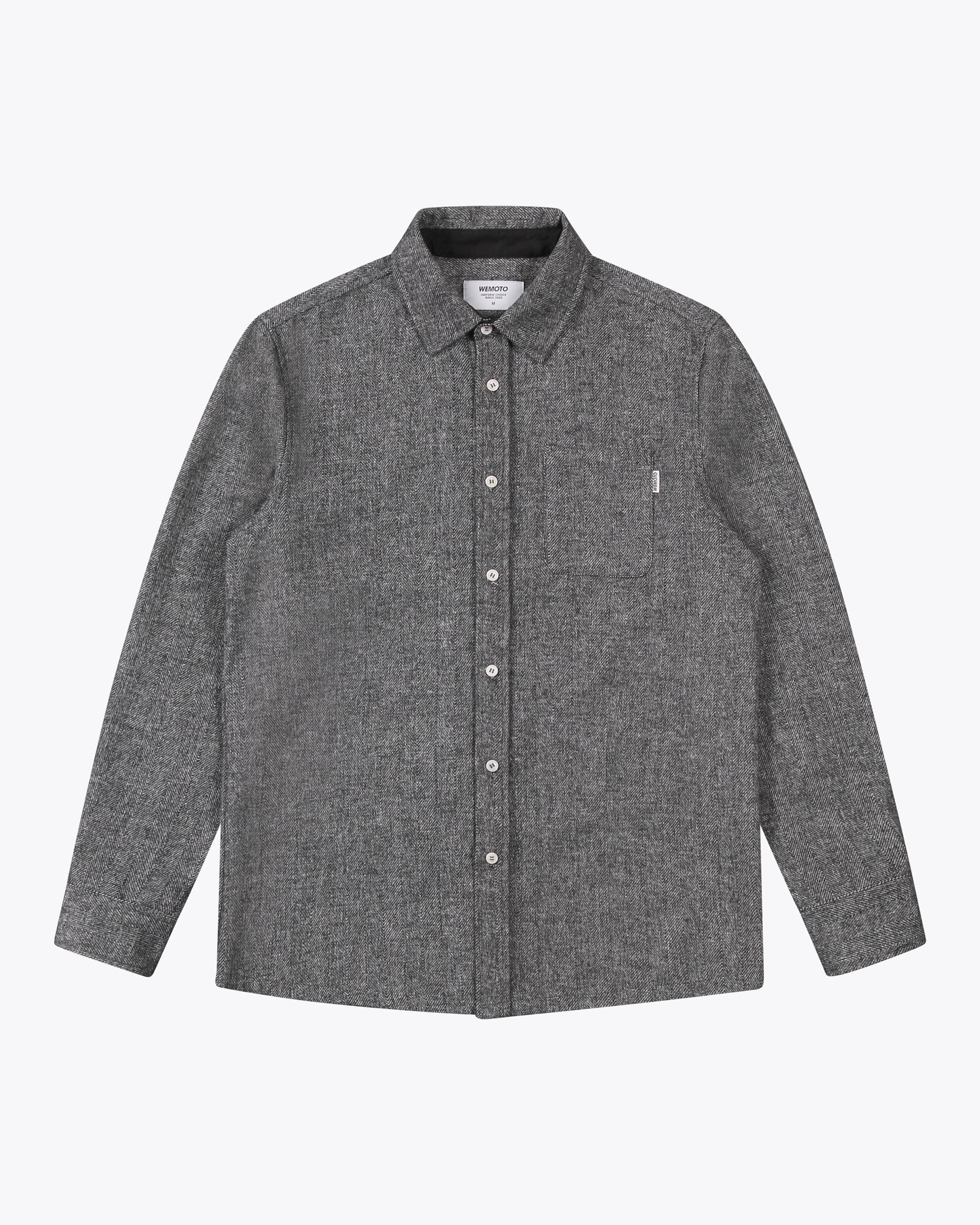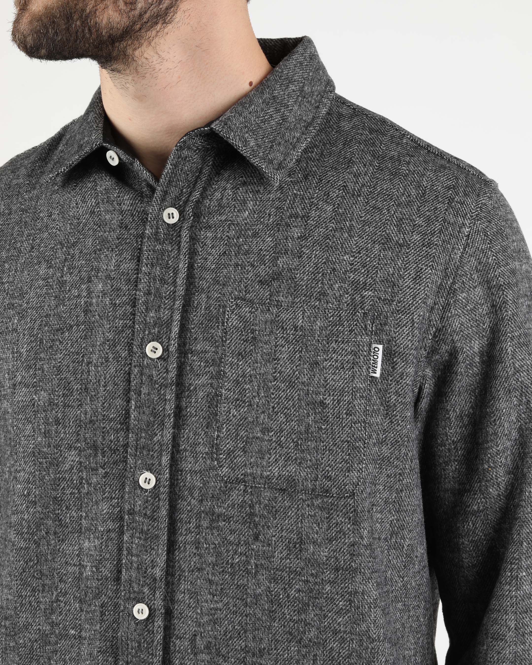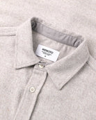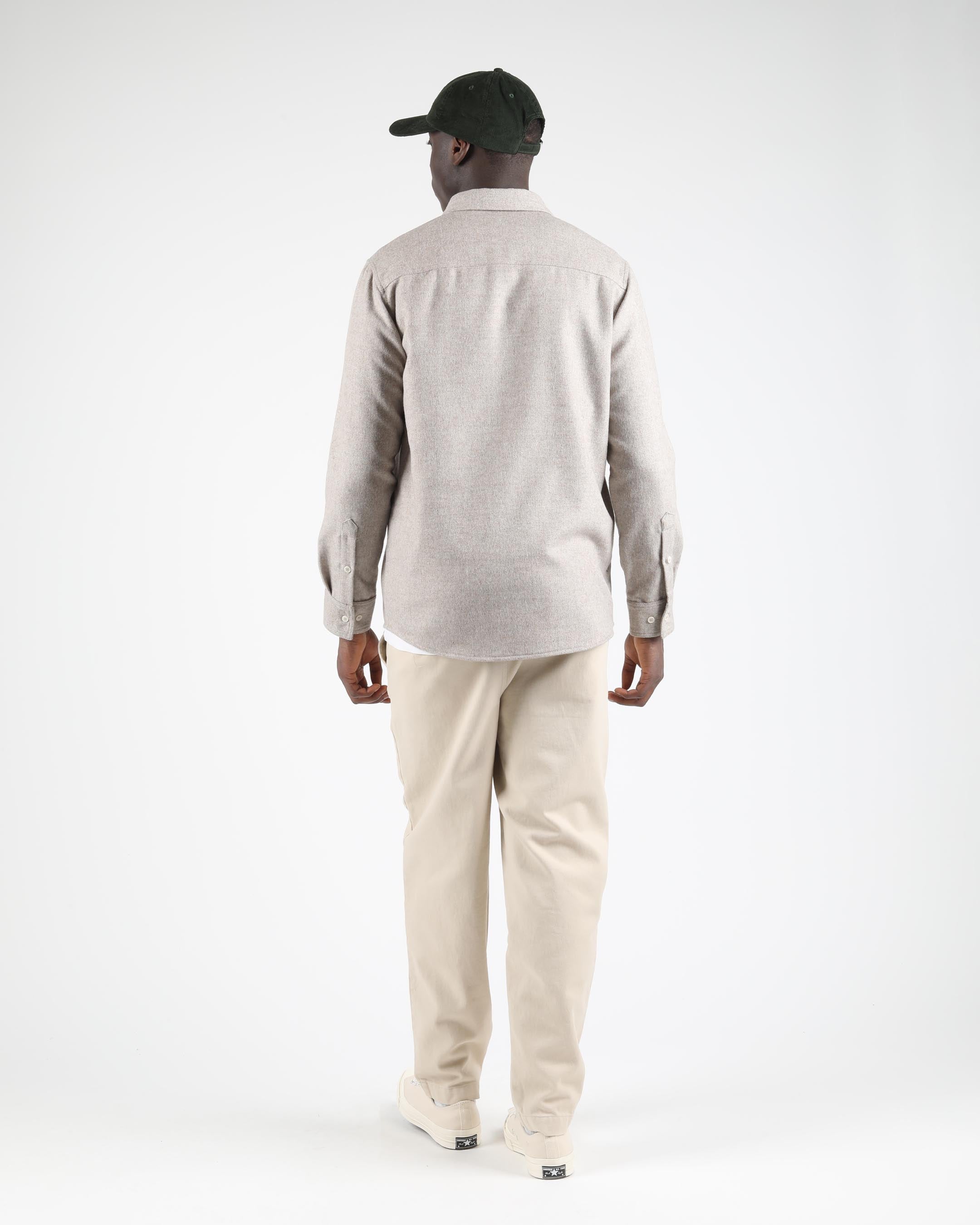 This regular-fit shirt is made from a 50% wool and 50% polyester blend, featuring a 420 G/SQM blended wool felt fabric. It includes a patch pocket at the chest, branded plastic buttons, and a double-layered back yoke.