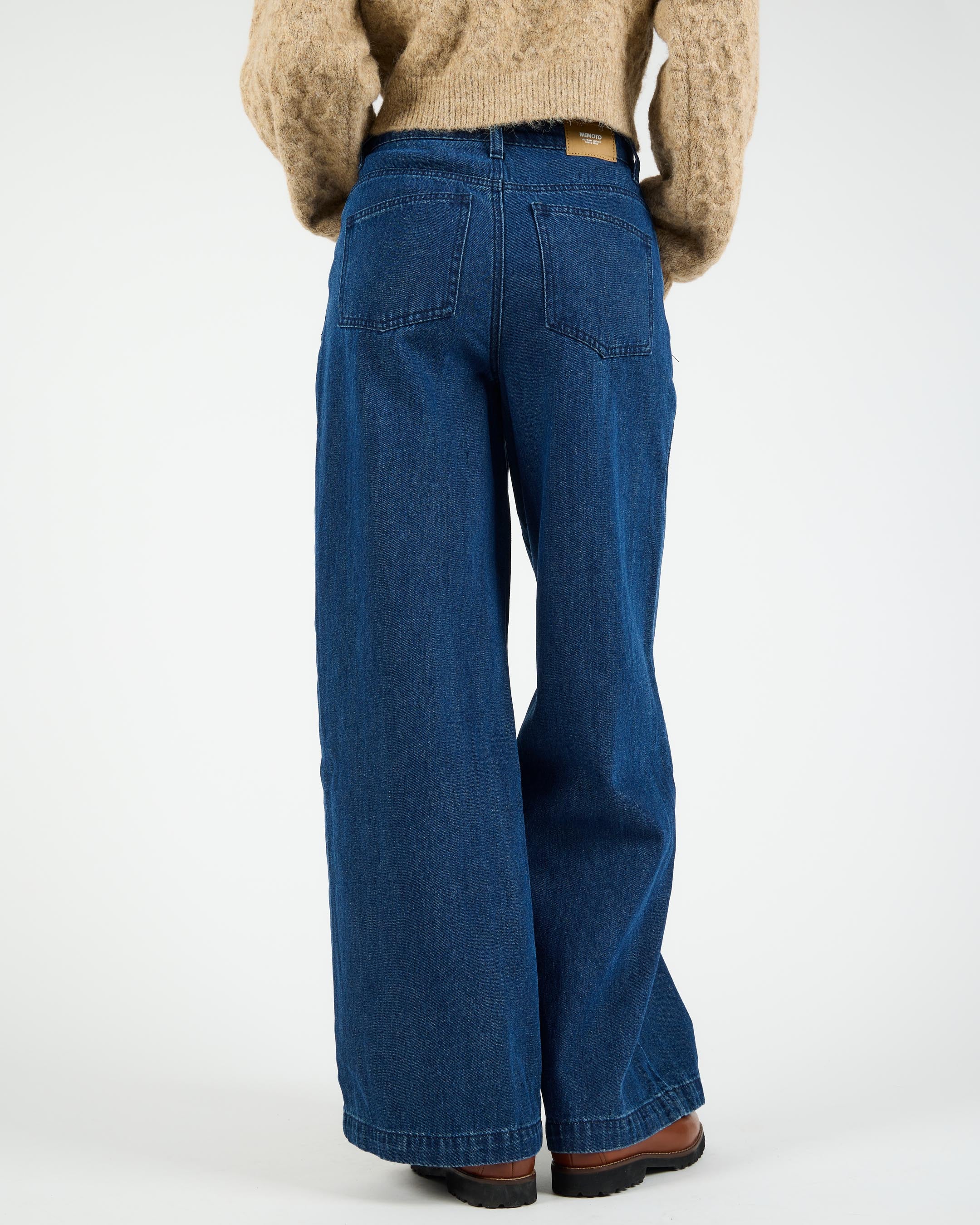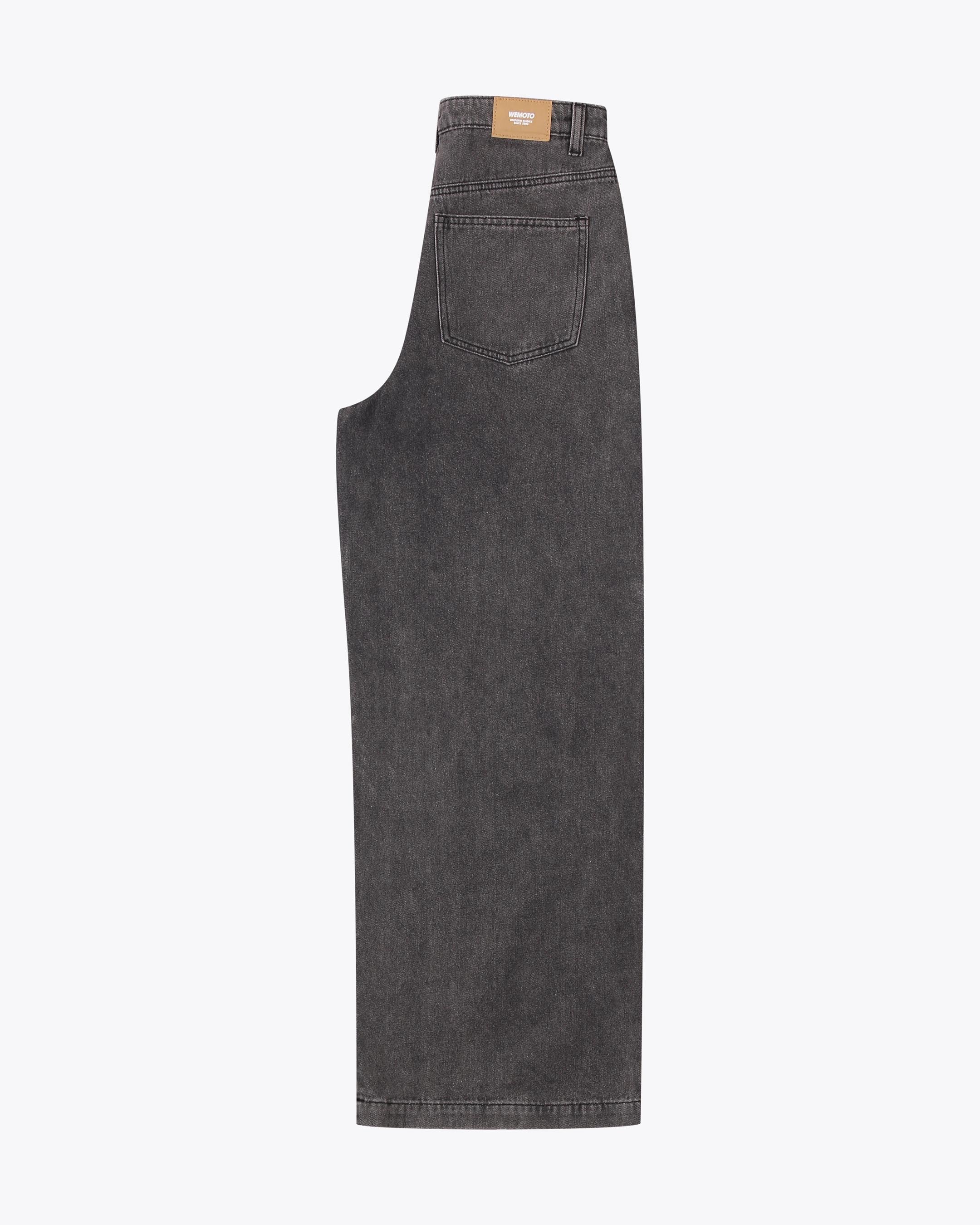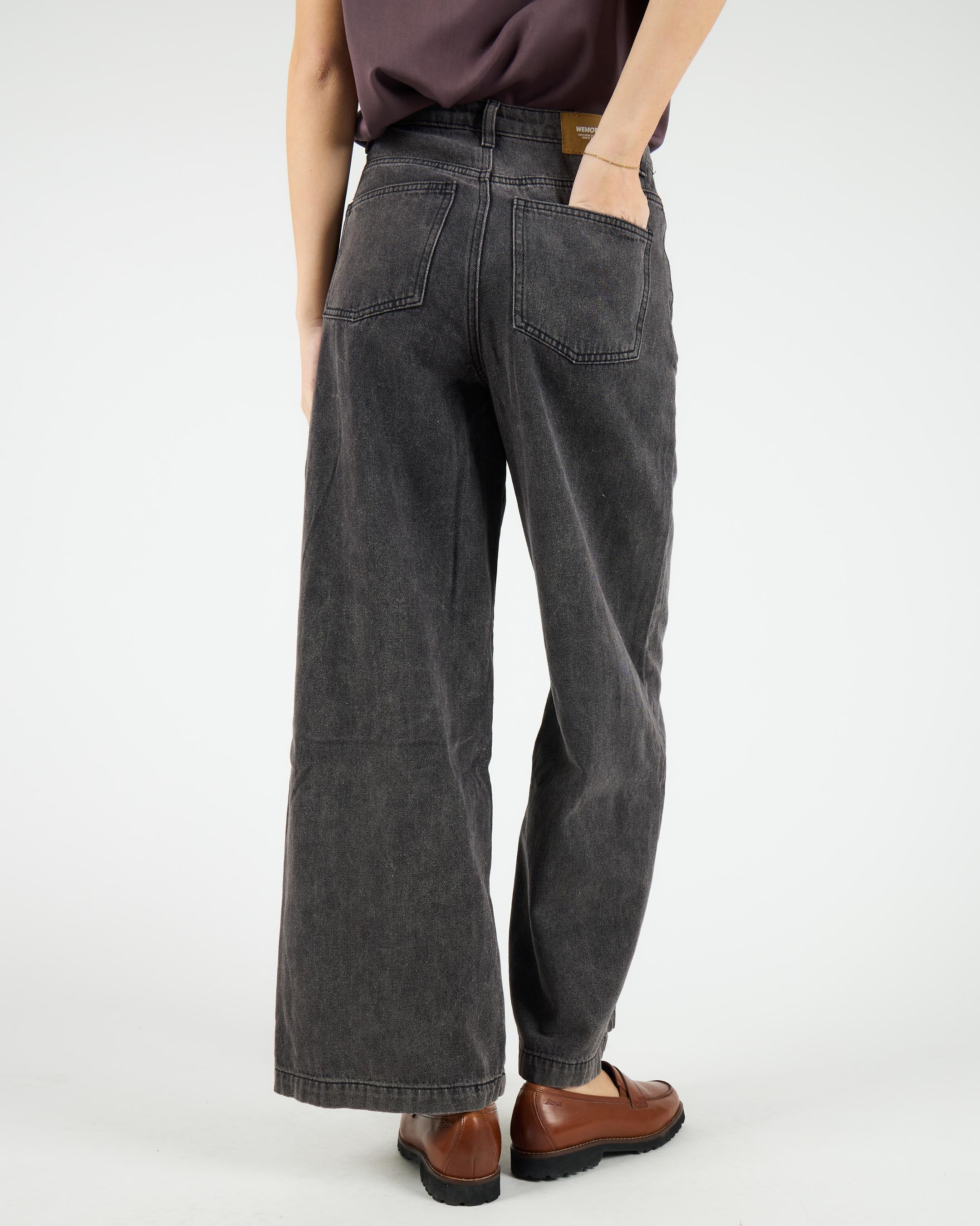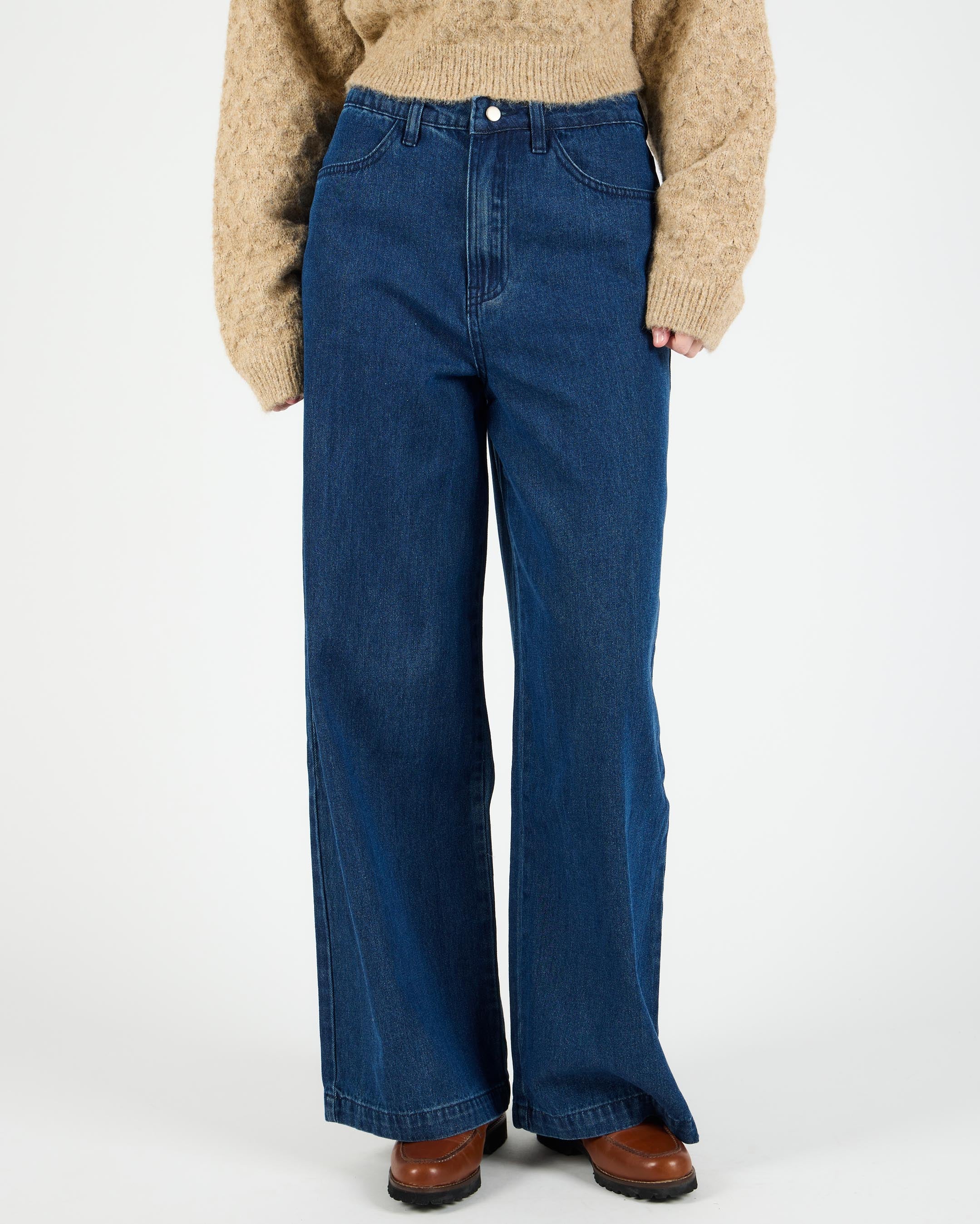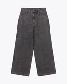 Crafted from 75% cotton / 25% polyester blended denim, 327 G/SQM, these relaxed fit trousers offer a high rise, wide leg, regular length, and are finished with a metal shank button, zip closure, and back patch pockets.