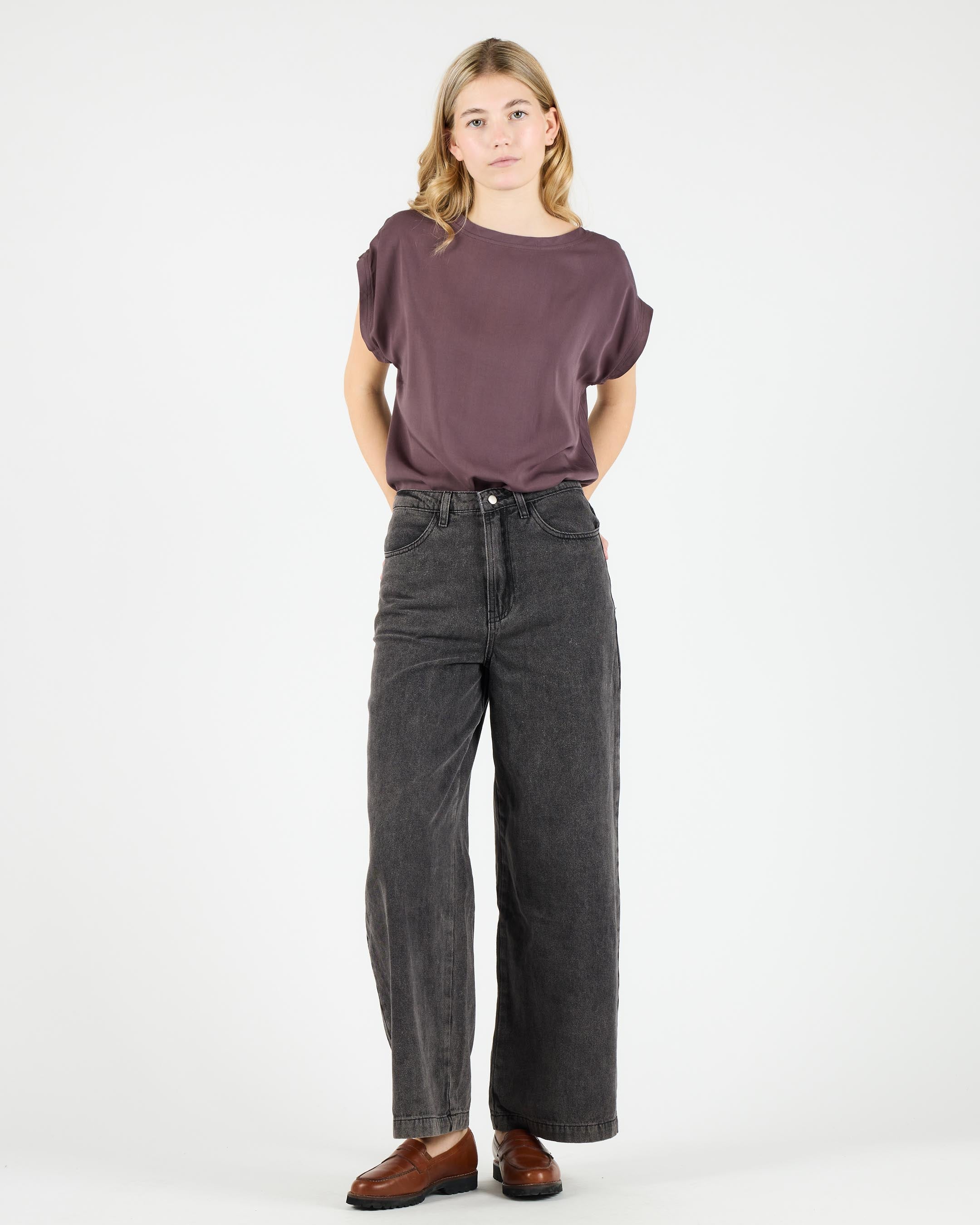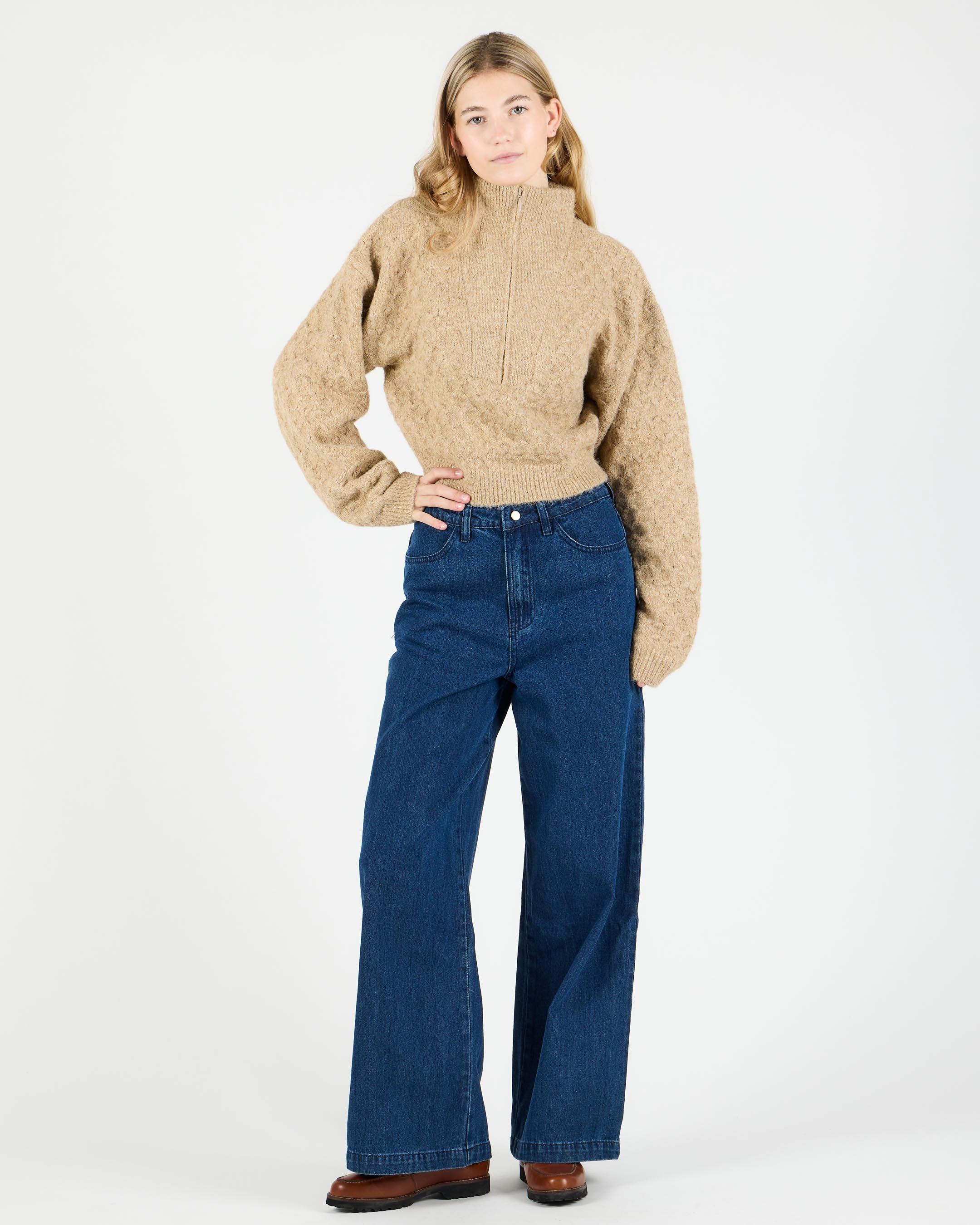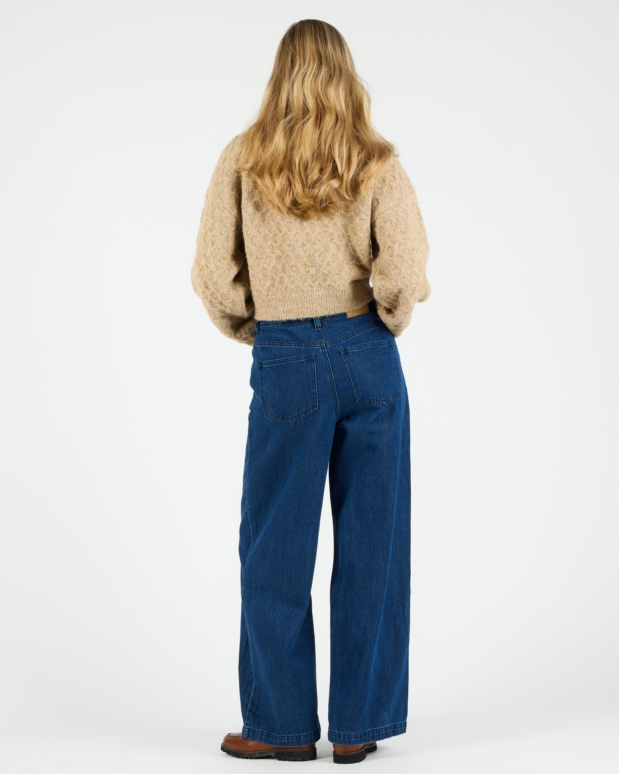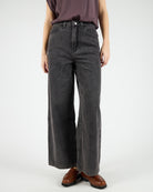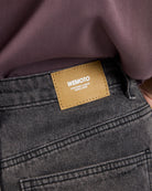 Crafted from 75% cotton / 25% polyester blended denim, 327 G/SQM, these relaxed fit trousers offer a high rise, wide leg, regular length, and are finished with a metal shank button, zip closure, and back patch pockets.