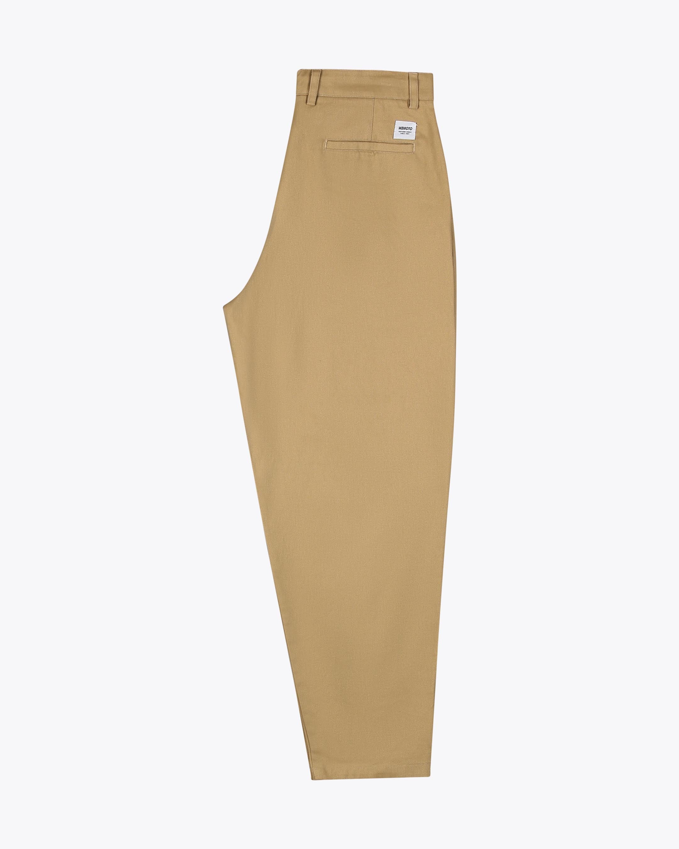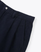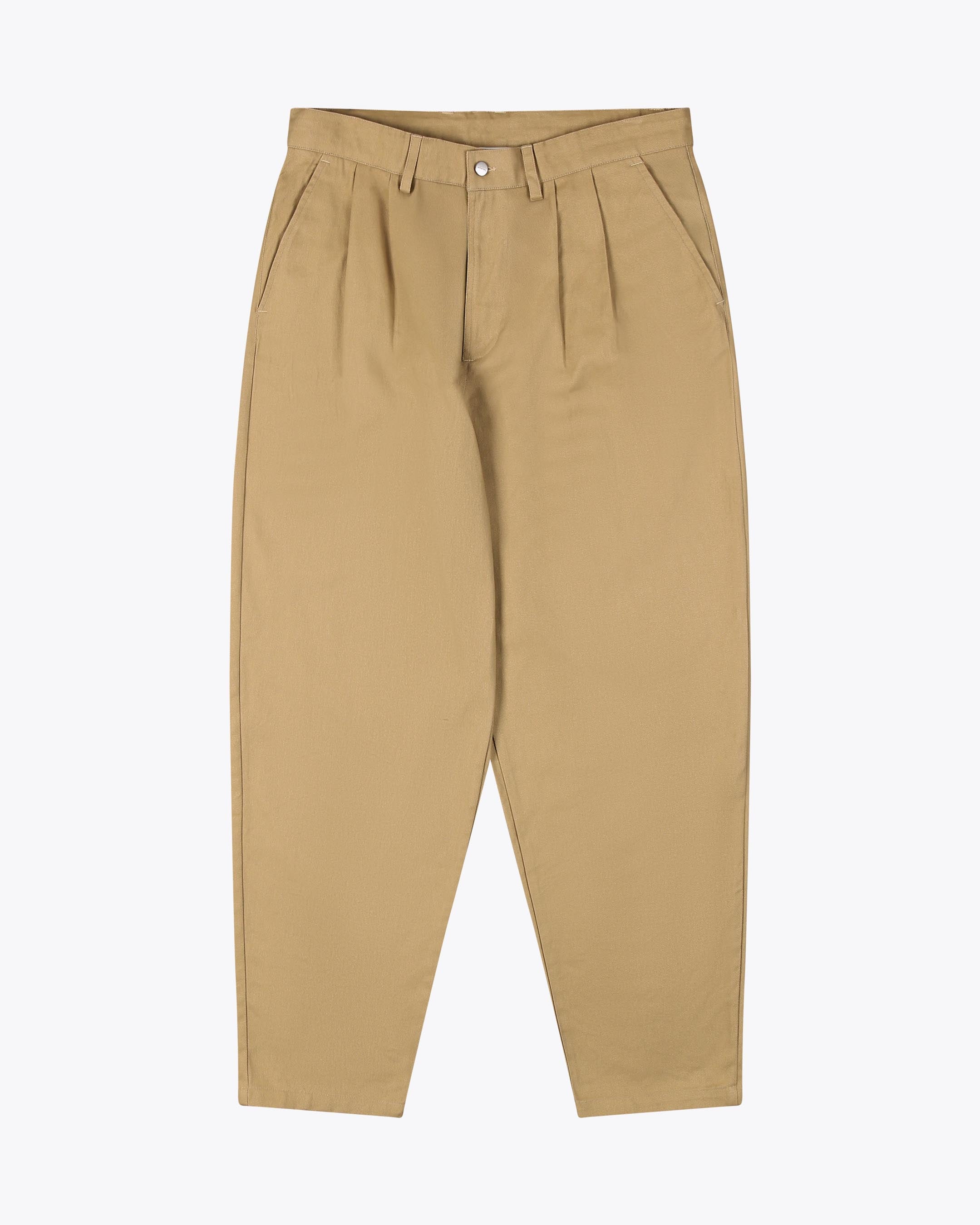 Made from 100% cotton twill, 280 G/SQM, these relaxed fit trousers have a regular rise, wide leg, and front pleats. They feature a branded metal shank button closure, an adjustable drawstring inside the waistband, and back welt pockets.