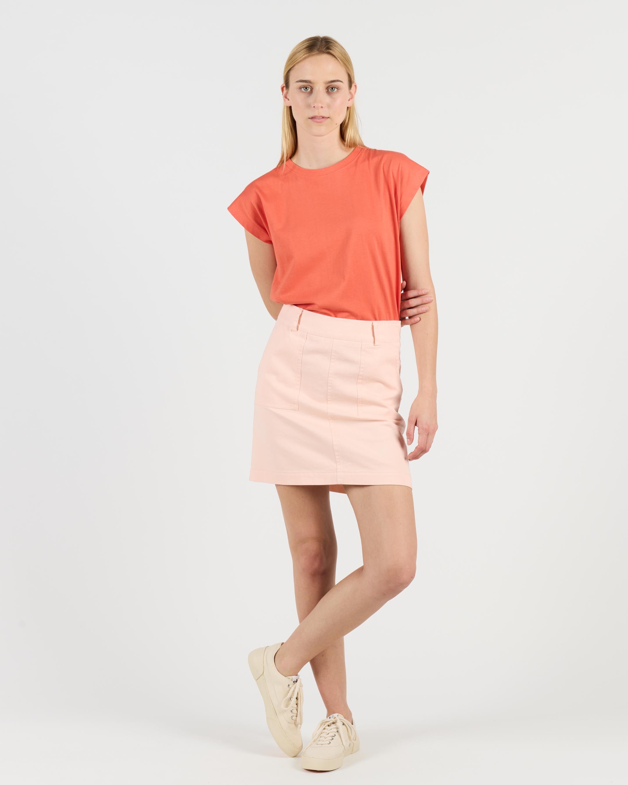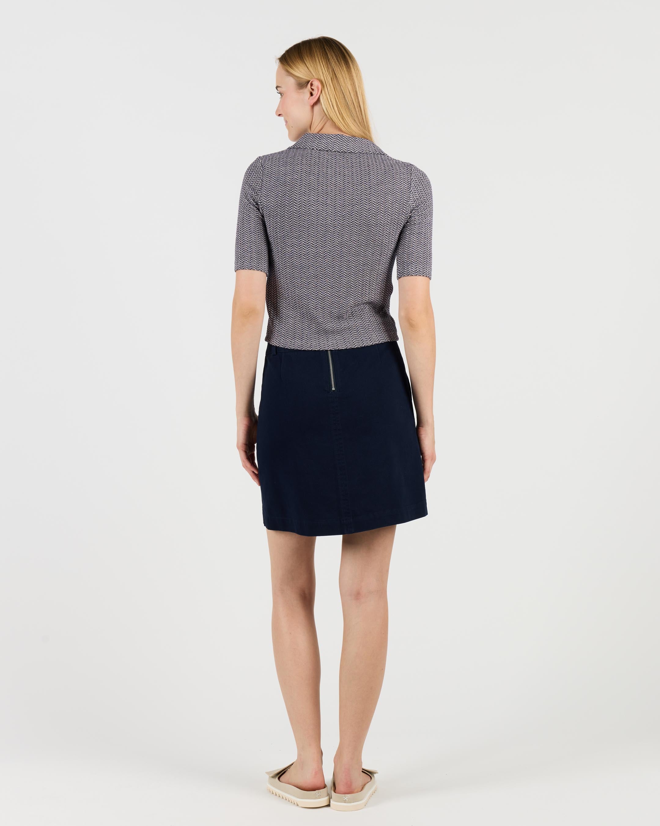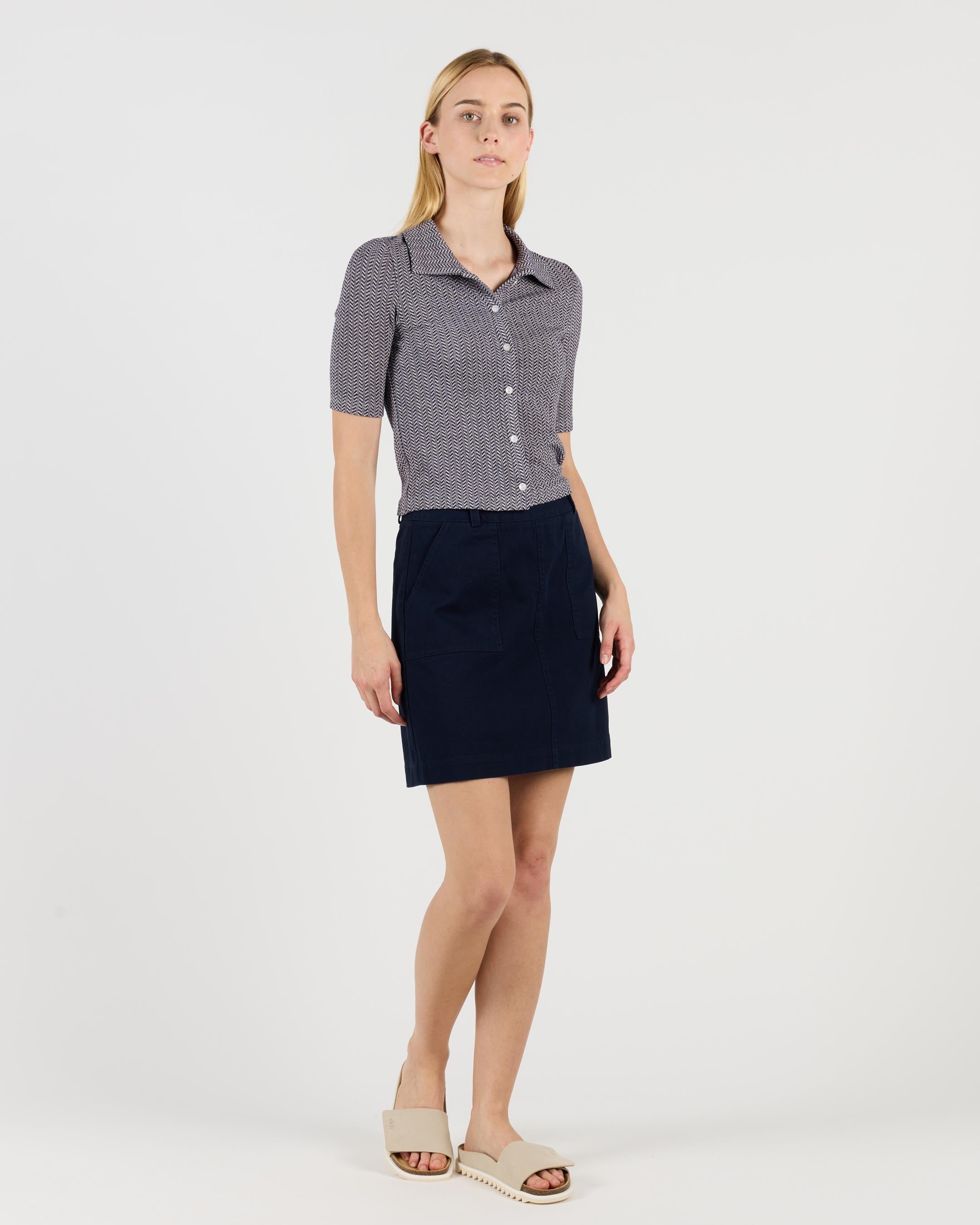 This knee-length skirt is made from durable 280 G/SQM cotton twill with a brushed finish. It features a regular fit, high waist, and a zip back closure.
