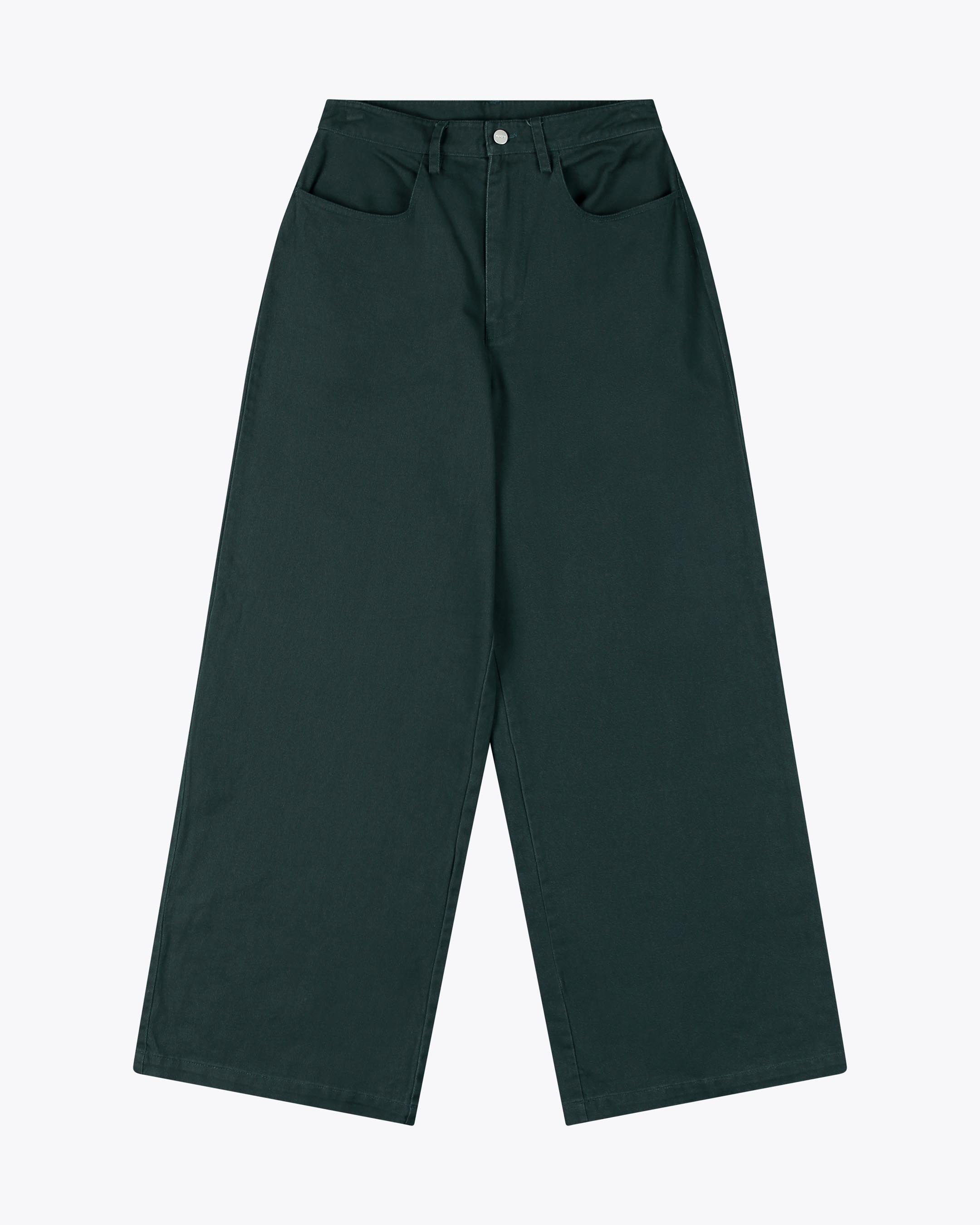Made from 100% cotton twill, 280 G/SQM, brushed for extra softness, these relaxed fit trousers feature a high rise, wide leg, regular length, and a metal shank button with zip closure, plus back patch pockets.