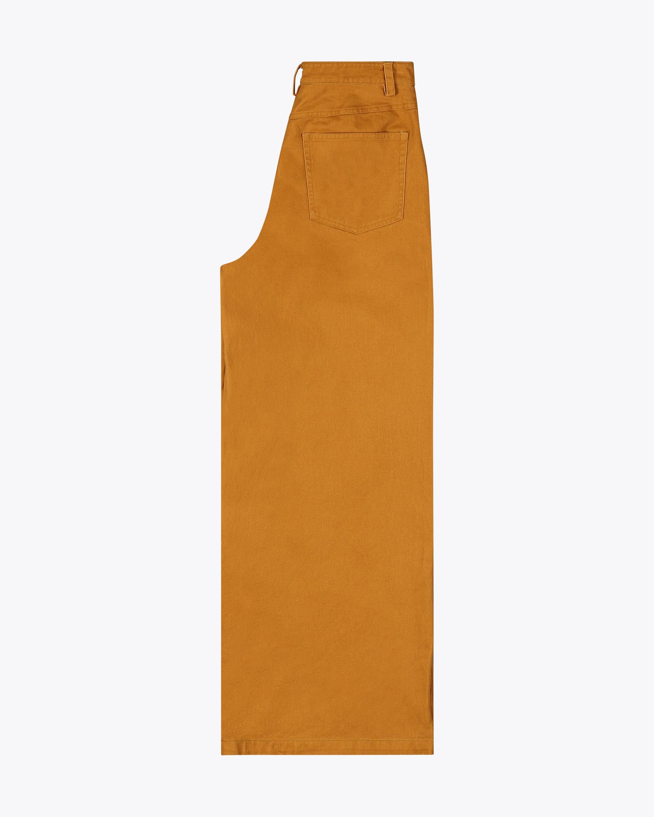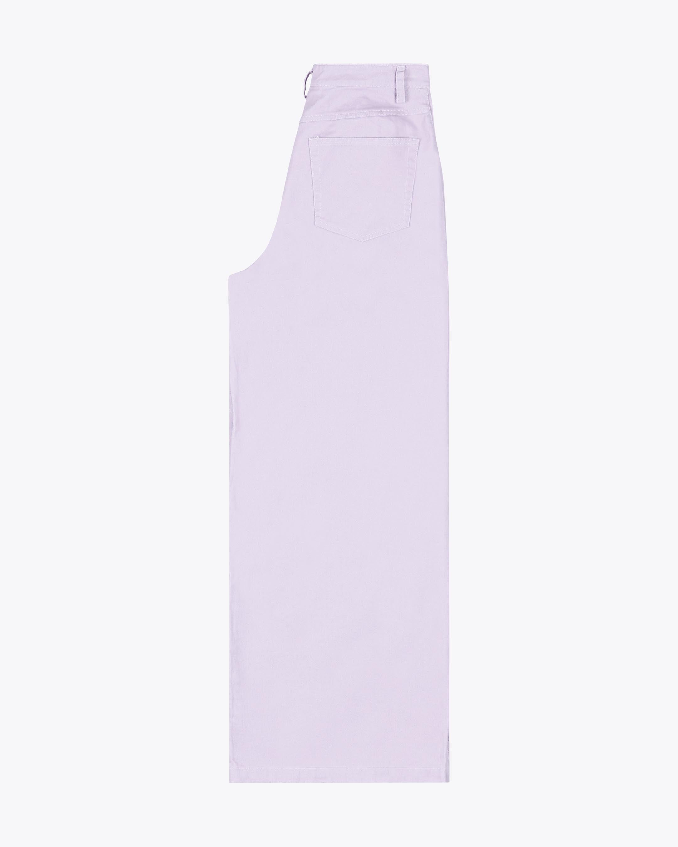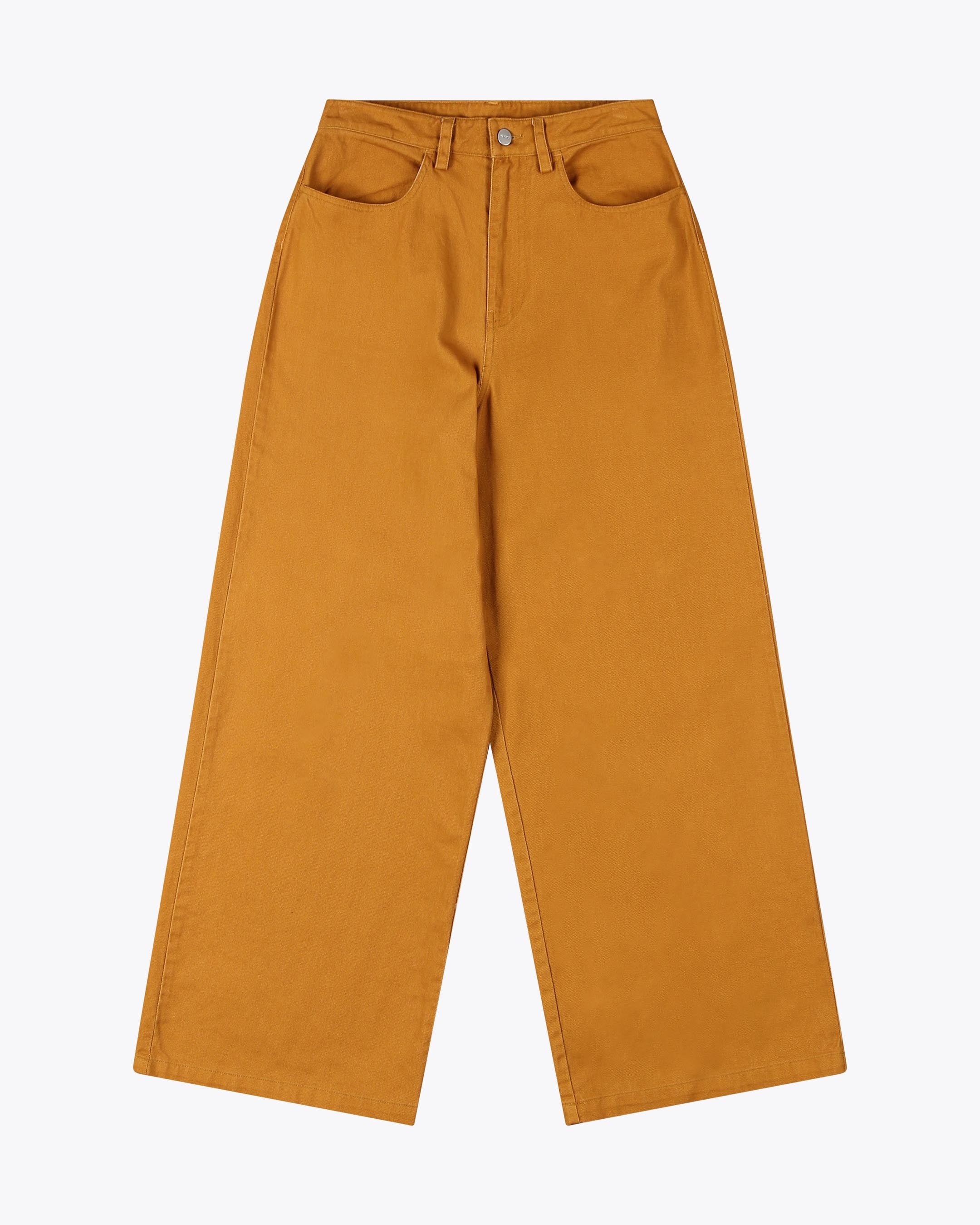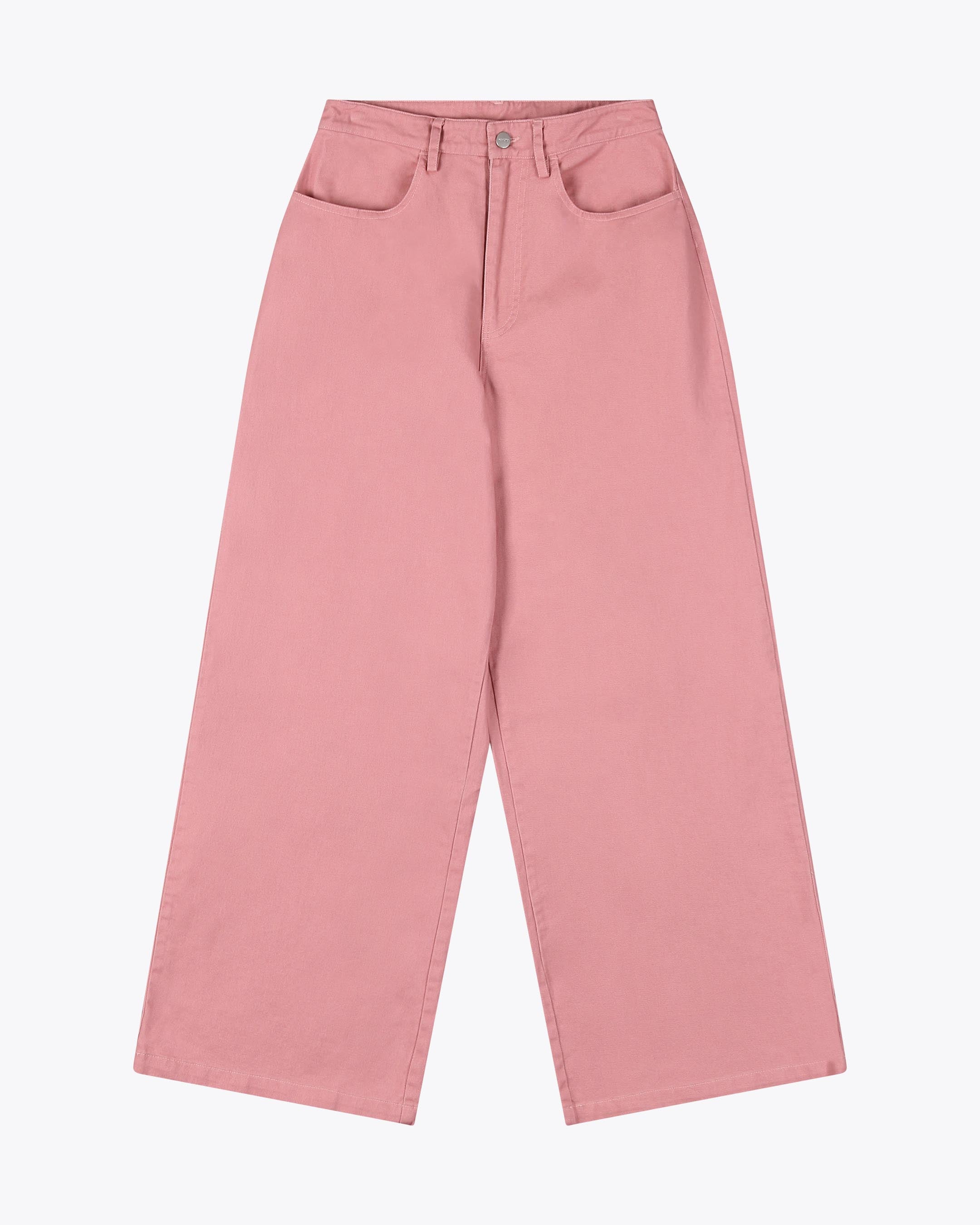 Made from 100% cotton twill, 280 G/SQM, brushed for extra softness, these relaxed fit trousers feature a high rise, wide leg, regular length, and a metal shank button with zip closure, plus back patch pockets.