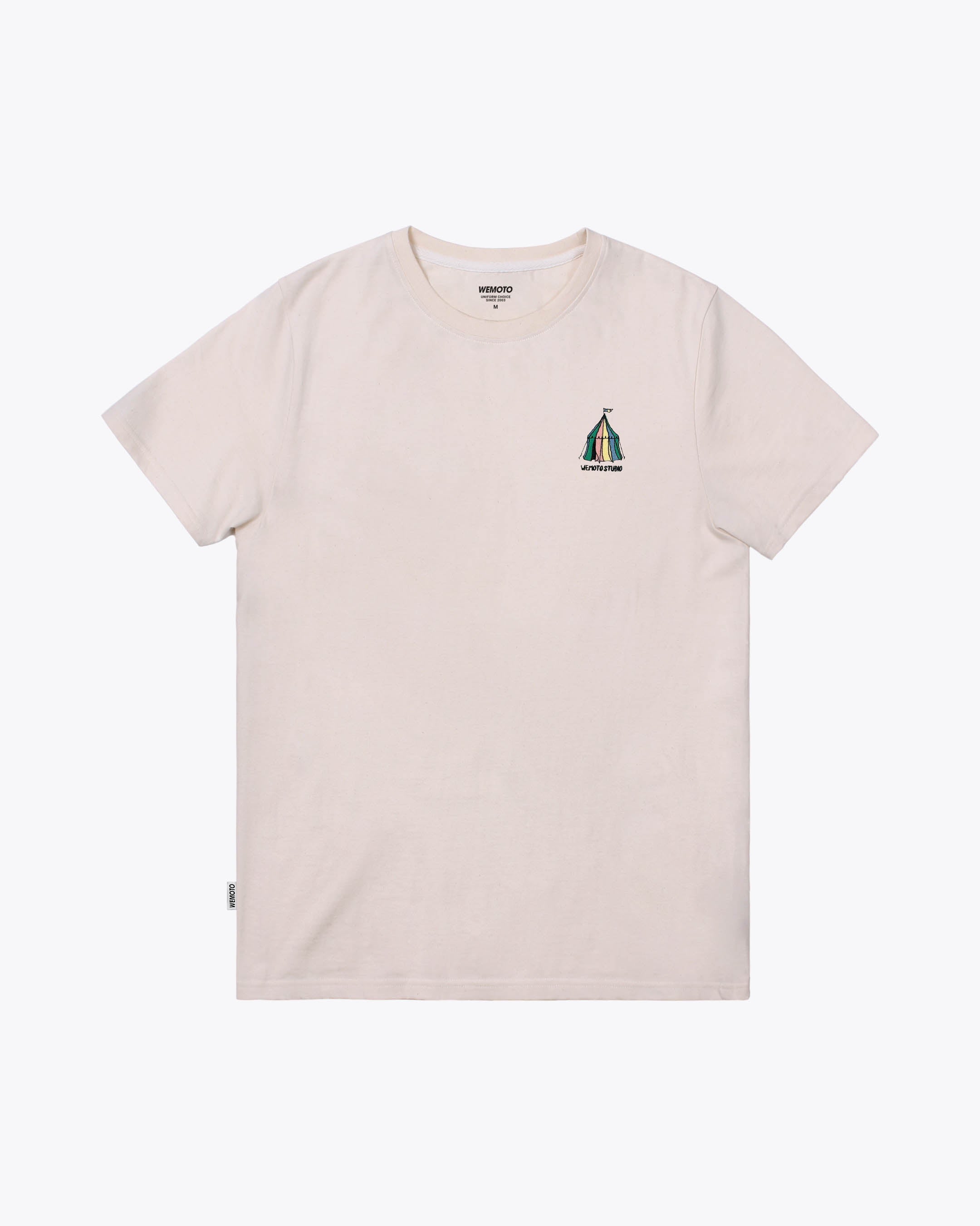 This T-shirt, crafted from 100% organic cotton with a 185 G/SQM single jersey, features a pre-washed finish for added softness. It offers a regular fit, an embroidered circus tent design at chest, and a soft rib roundneck collar. GOTS certified fabric ensures responsible sourcing.
